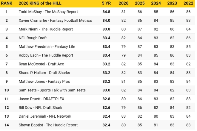 Link to draft analyst’s Top 100/Huddle standings, participants: https://www.thehuddlereport.com/big-board-5-year